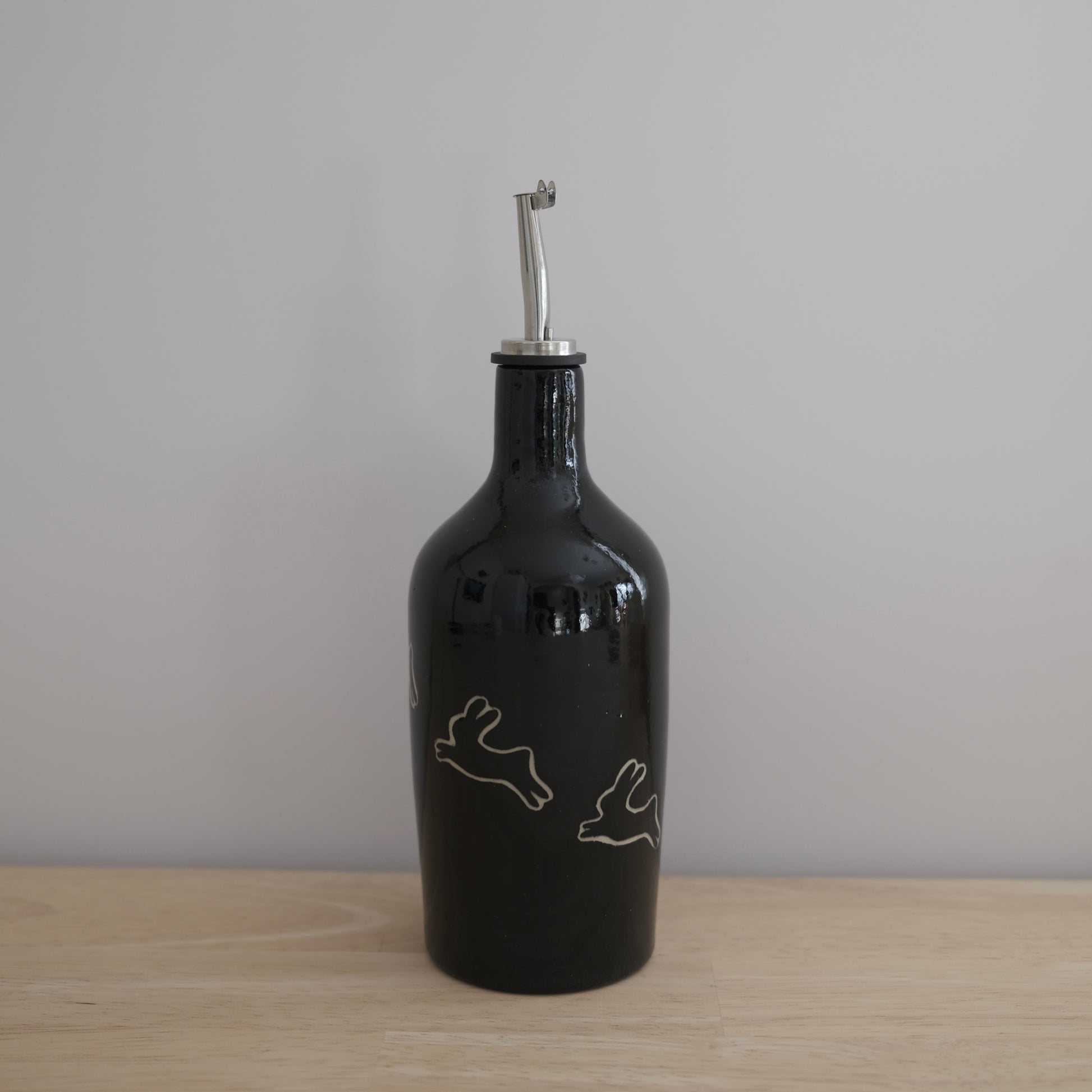8" wheel thrown stoneware olive oil bottle glazed with a glossy finish.